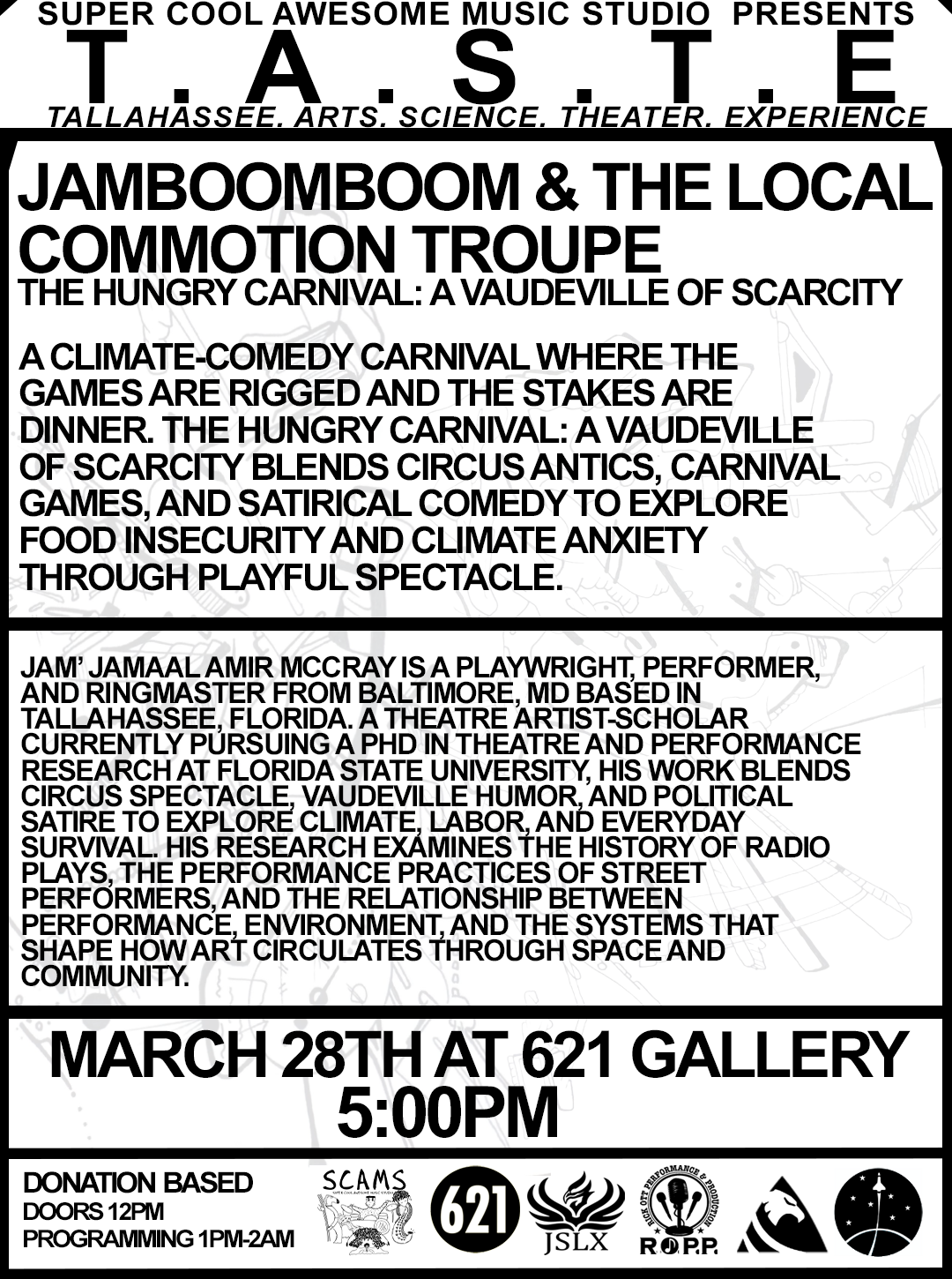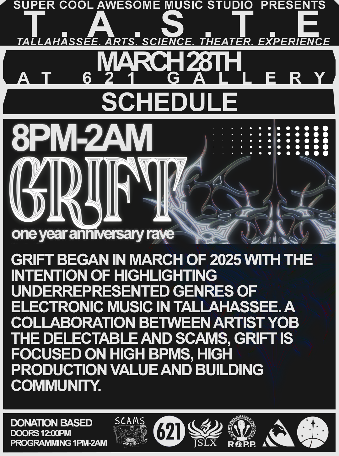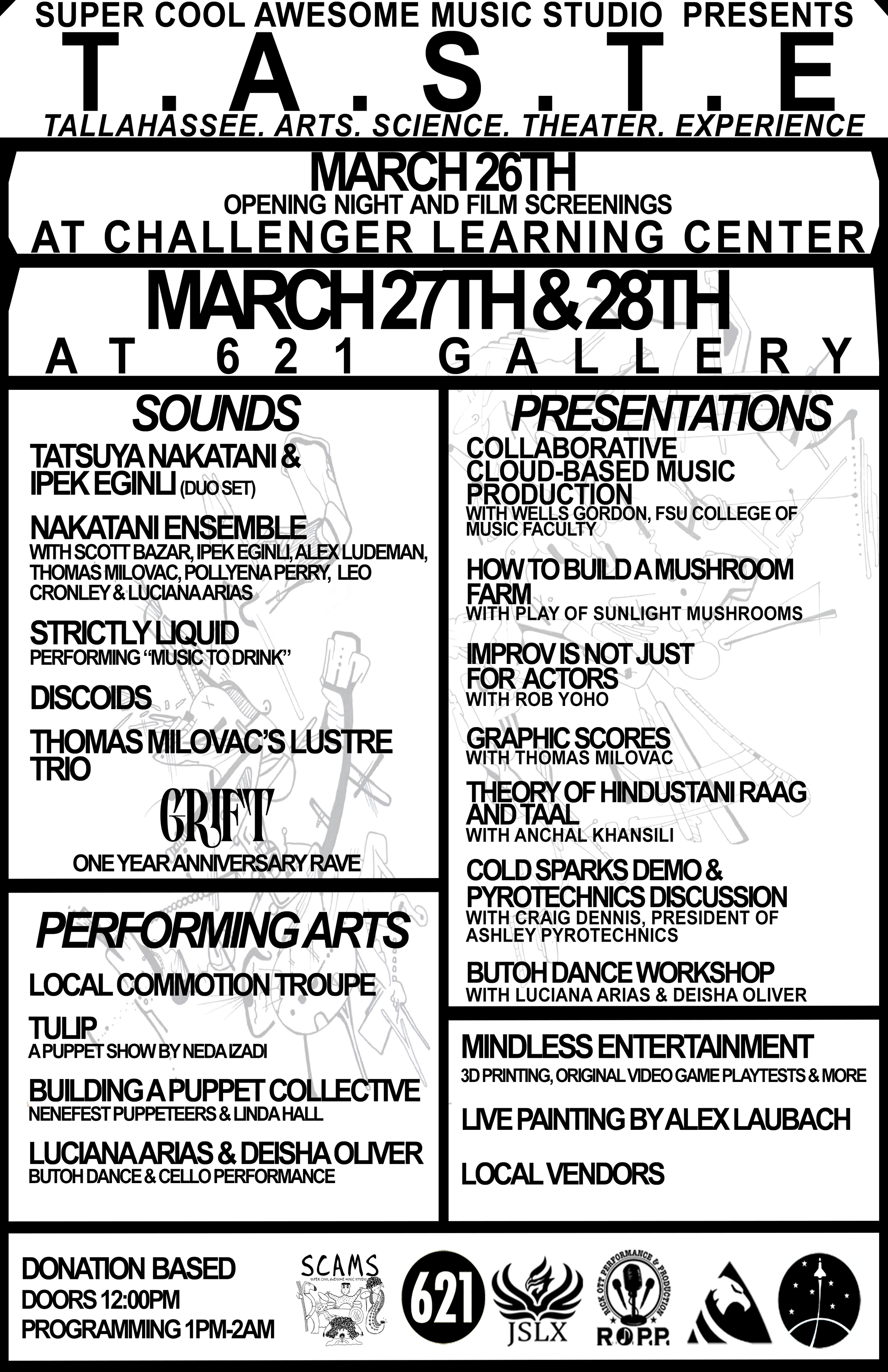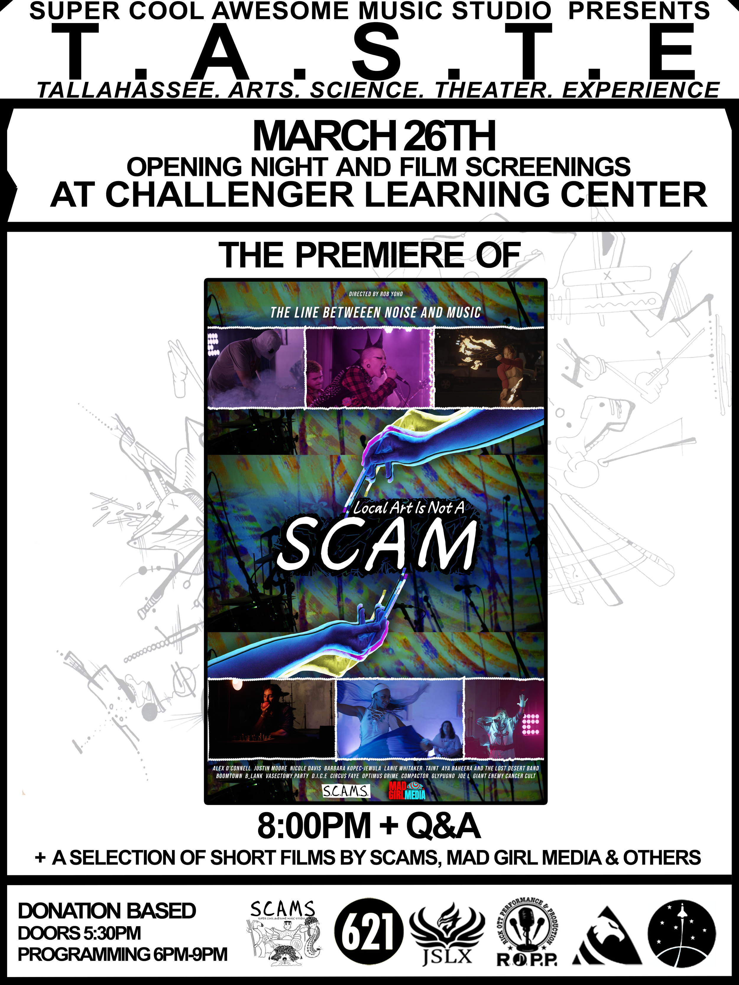 The Tallahassee Arts, Science, Theater Experience (T.A.S.T.E.) is an entirely donation-based, non-profit festival concept created by S.C.A.M.S. The first annual experience is set for March 26th-28th, 2026. T.A.S.T.E. is registered as an incorporated non-profit organization awaiting 501c3 status.