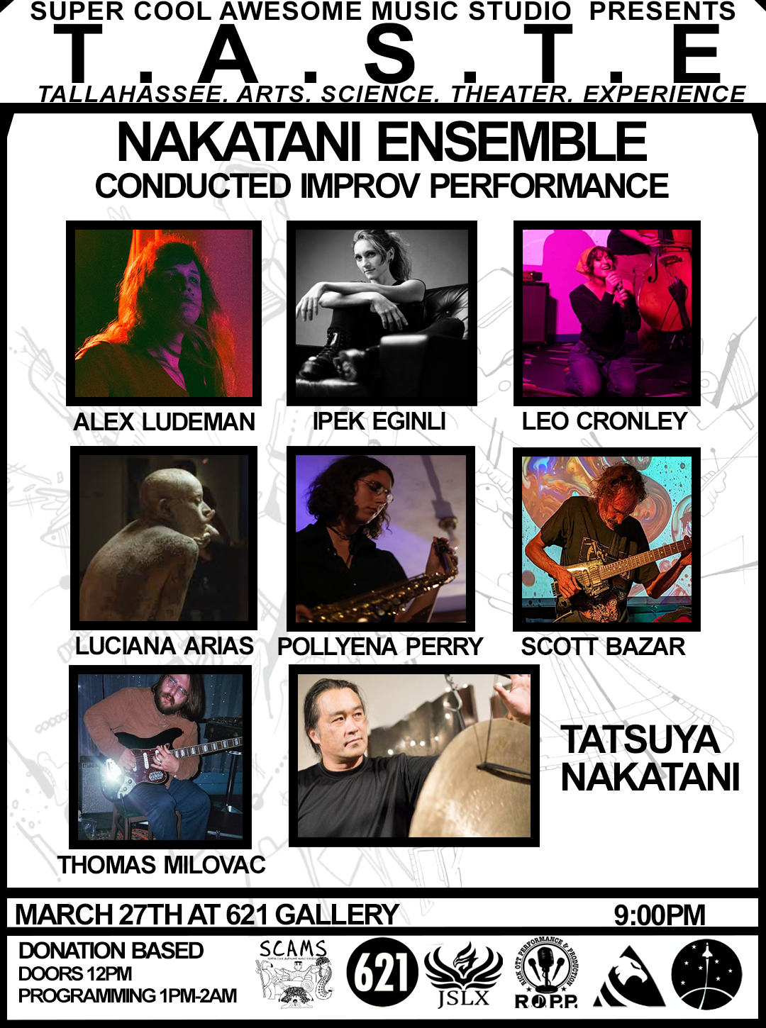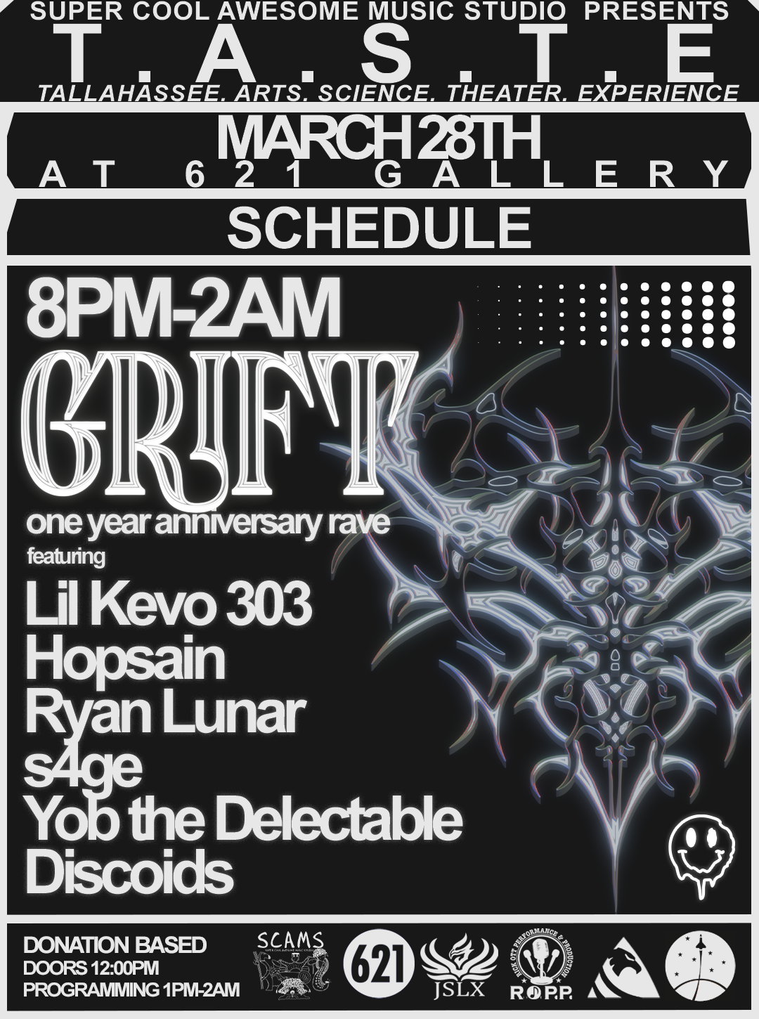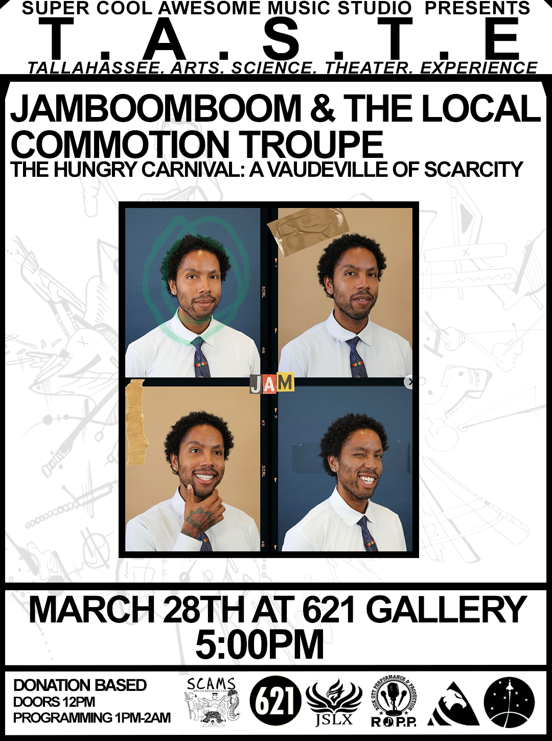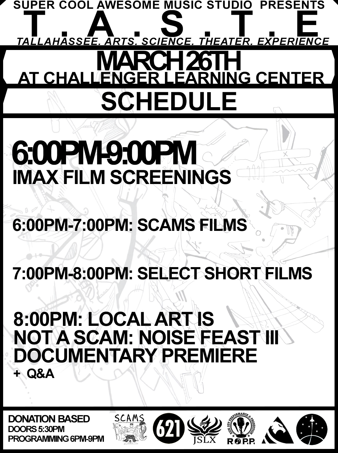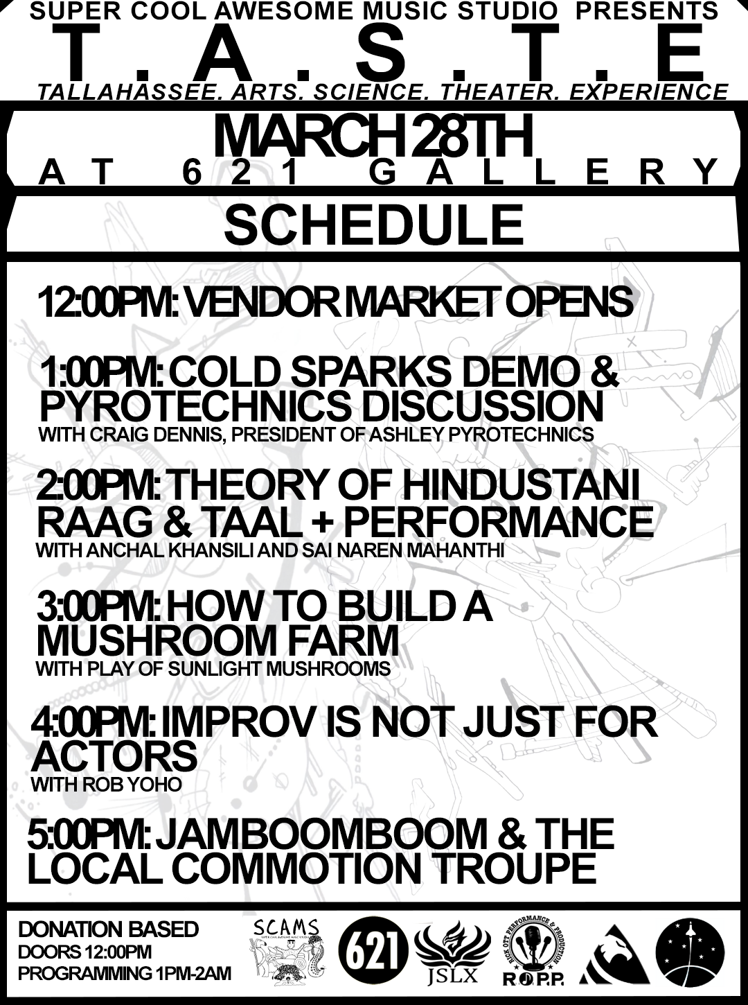 The Tallahassee Arts, Science, Theater Experience (T.A.S.T.E.) is an entirely donation-based, non-profit festival concept created by S.C.A.M.S. The first annual experience is set for March 26th-28th, 2026. T.A.S.T.E. is registered as an incorporated non-profit organization awaiting 501c3 status.