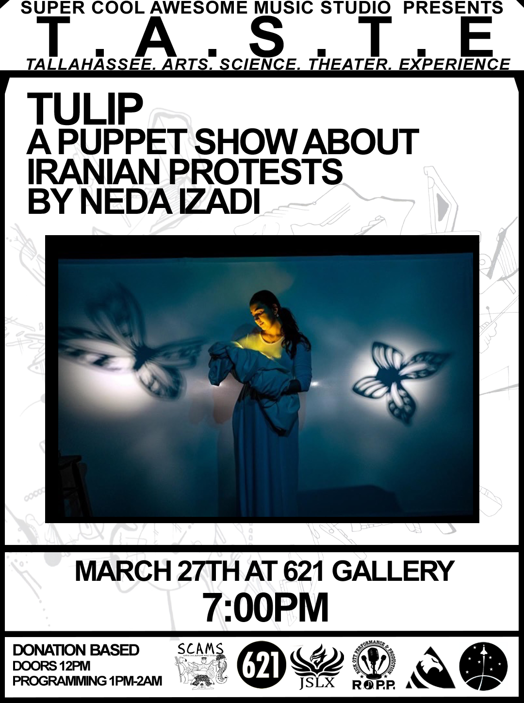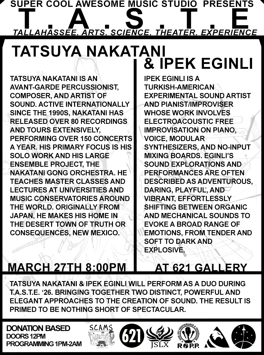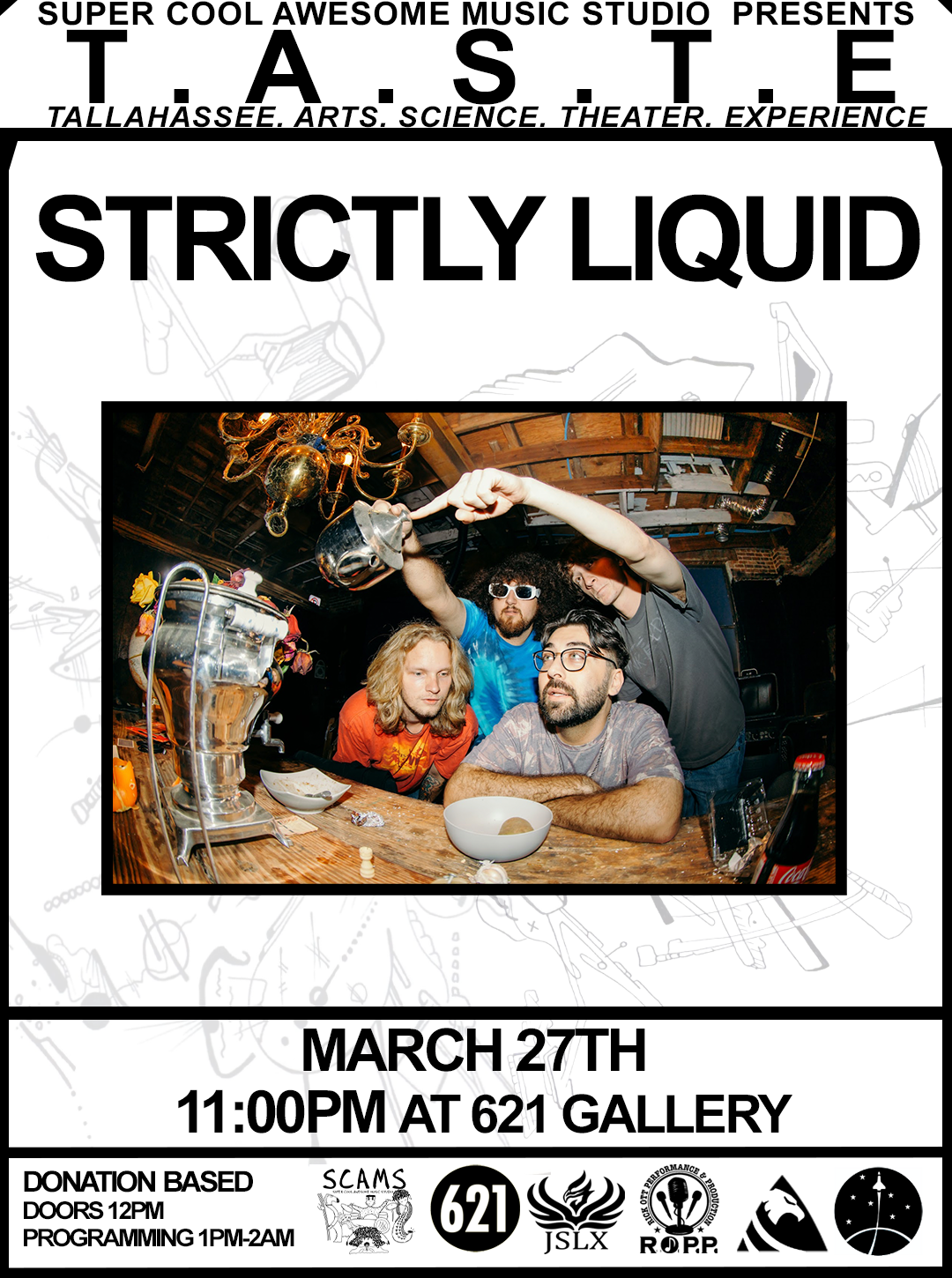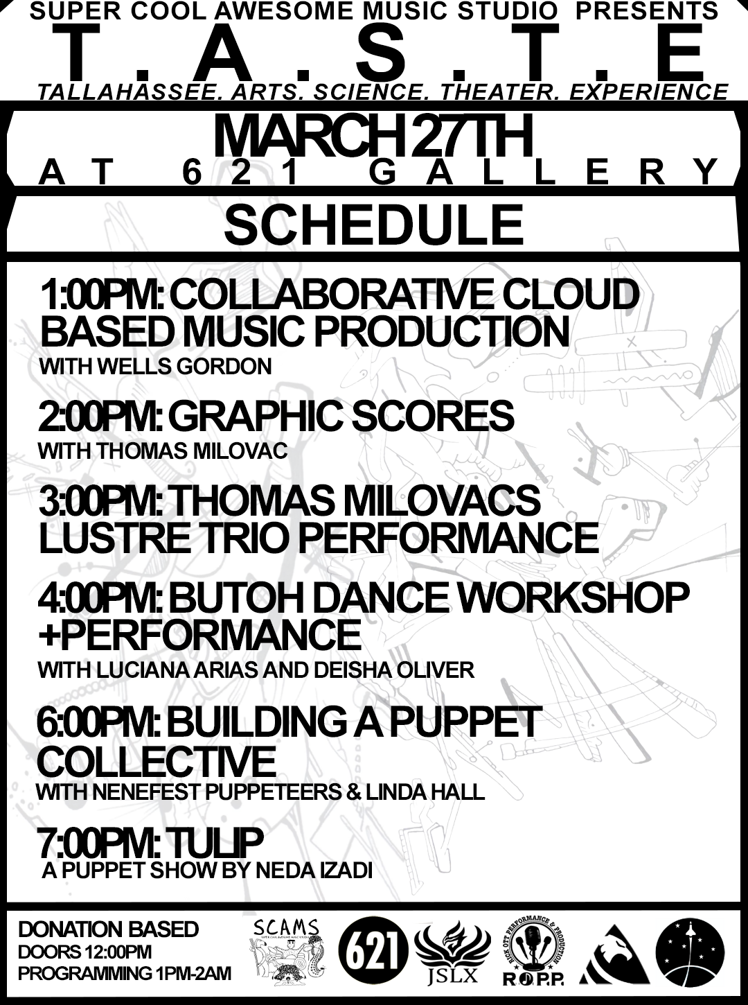 The Tallahassee Arts, Science, Theater Experience (T.A.S.T.E.) is an entirely donation-based, non-profit festival concept created by S.C.A.M.S. The first annual experience is set for March 26th-28th, 2026. T.A.S.T.E. is registered as an incorporated non-profit organization awaiting 501c3 status.