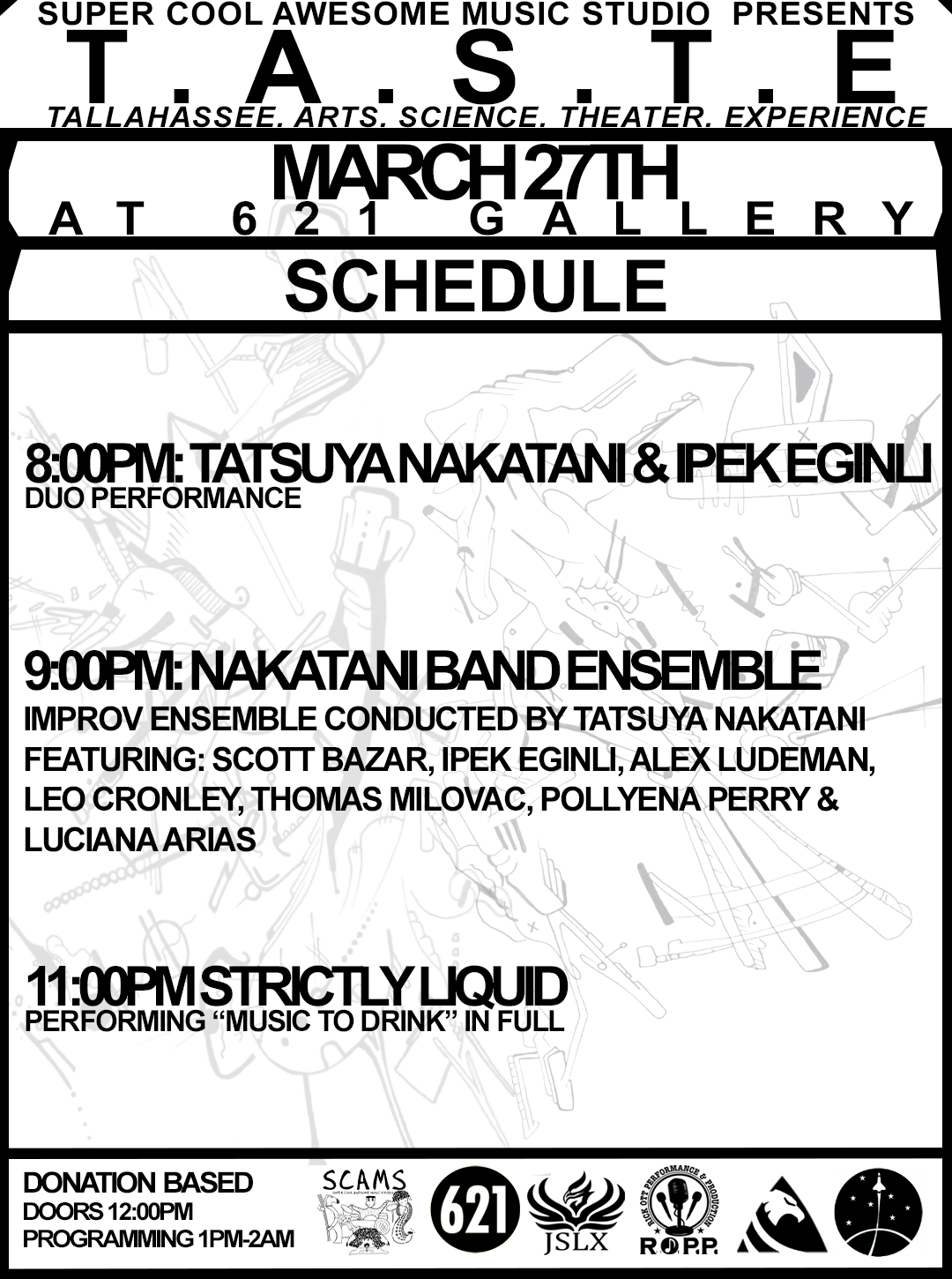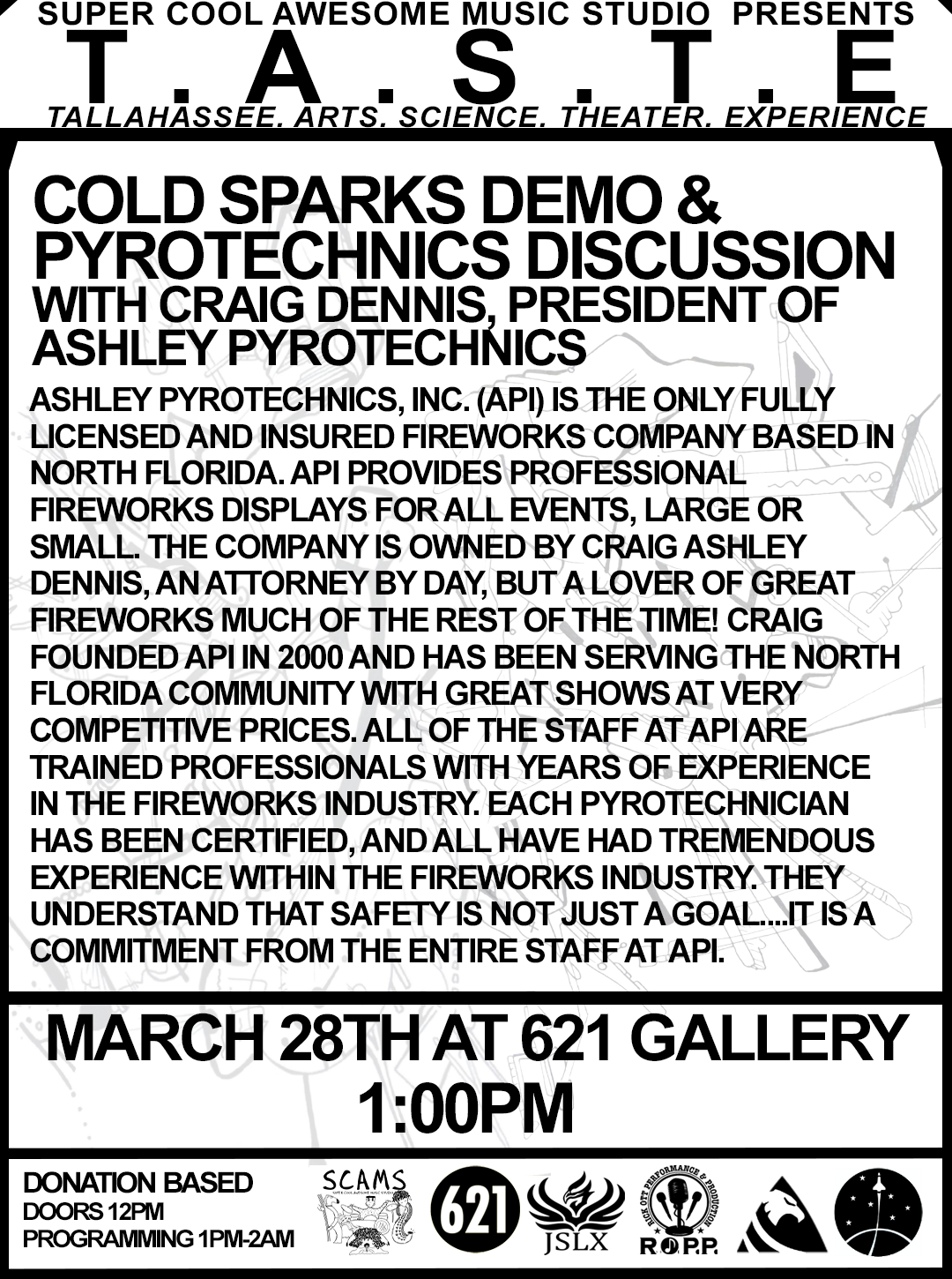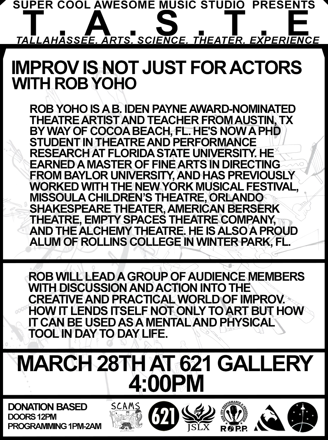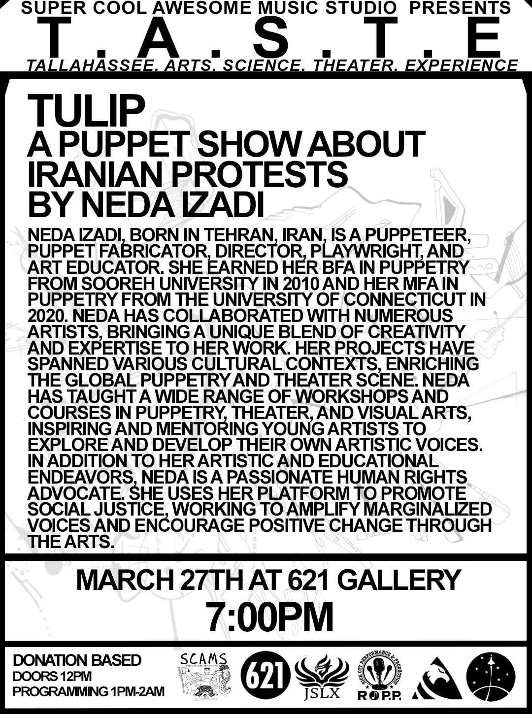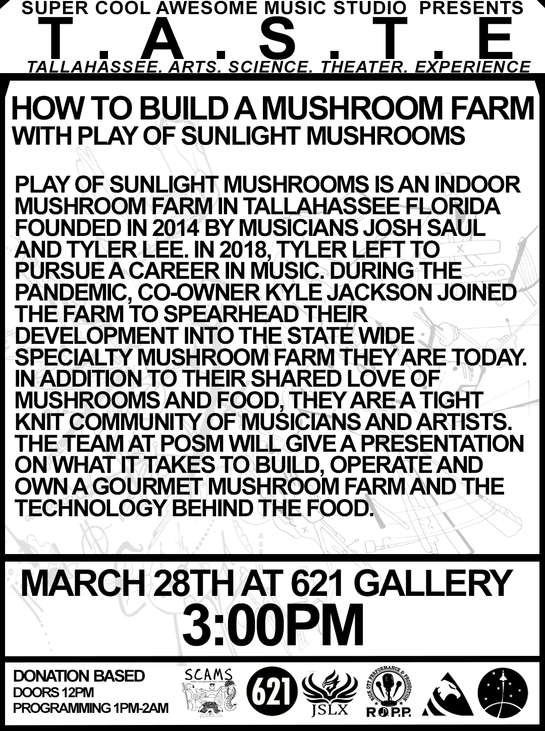 The Tallahassee Arts, Science, Theater Experience (T.A.S.T.E.) is an entirely donation-based, non-profit festival concept created by S.C.A.M.S. The first annual experience is set for March 26th-28th, 2026. T.A.S.T.E. is registered as an incorporated non-profit organization awaiting 501c3 status.